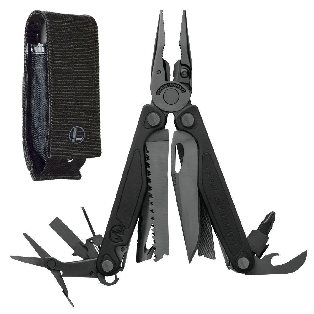 The Leatherman Charge + Black Multi-tool is an 19-in-1 multi-tasker with all locking features, outside-accessible tools that can be opened and locked with just one hand, and a two large bit drivers. Every tool on the Charge Plus is built to perform on any job or adventure. The strong, corrosion-resistant blade is made of 154CM steel with a black oxide finish, the wire cutters are durable and replaceable, and the robust scissors cut through virtually anything.