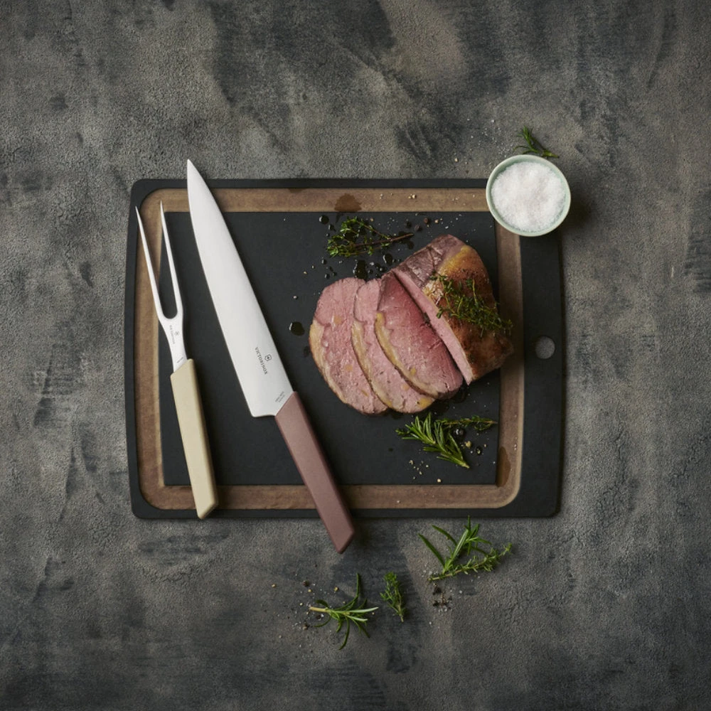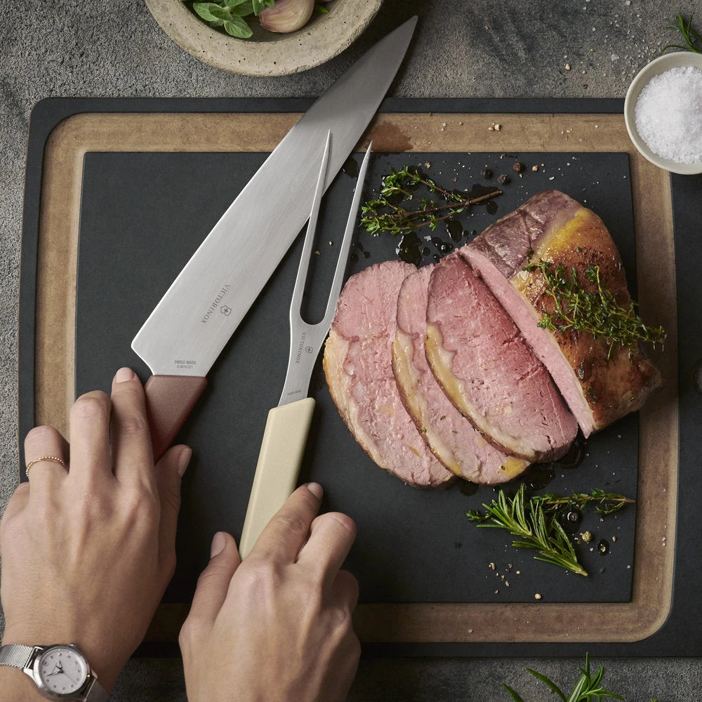 The Swiss Modern Colors 2-Piece Carving Set by Victorinox includes an 8.5-inch carving knife with a grape red handle, and a 6-inch carving fork with an almond beige handle. This set, designed to carve roast beef, turkey or any larger meats in the kitchen or table-side, features handles with a fresh Scandinavian color scheme to brighten any occasion.