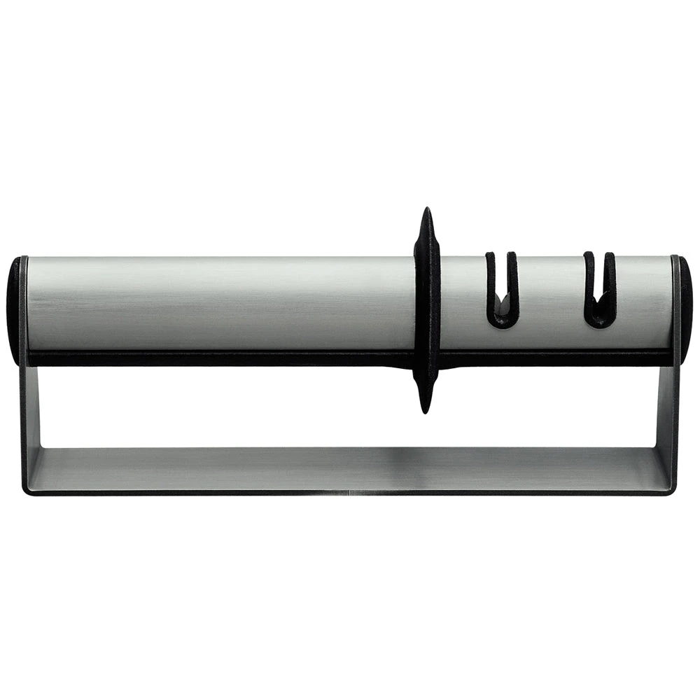 Even the finest cutlery loses its razor sharp edge over time. The TWINSHARP Select Knife Sharpener by Zwilling J.A. Henckels is an innovative sharpener designed to quickly and easily restore the performance of your cutlery. This Stainless Steel sharpener has two separate sharpening modules to sharpen knives simply, safely and effectively. Using steel wheels, Module 1 is able to gently remove small nicks and inconsistencies on the blade edge that come from routine use of the knife. Module 2 then gently smoothes the edge and restores the blade’s sharpness. Rubber feet keep the sharpener from sliding on the countertop.