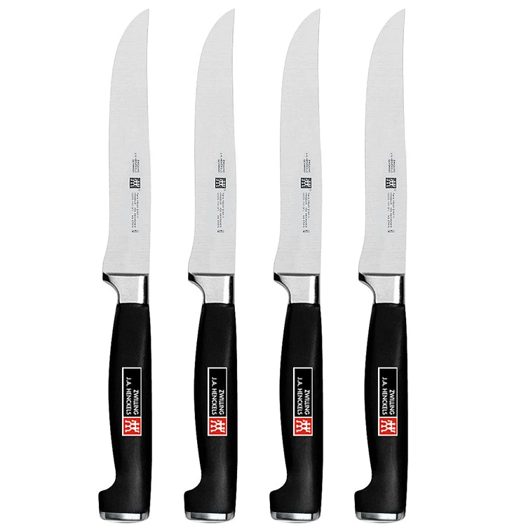 The Zwilling TWIN Four Star II 4-Piece Steak Set includes four steak knives with blades designed to tackle any steak. The Four Star II design adds to any table setting.